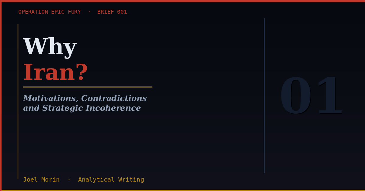 This is a synthesis of Brief 001 of the Operation Epic Fury series — a fictional analytical scenario examining the current Middle East conflict.